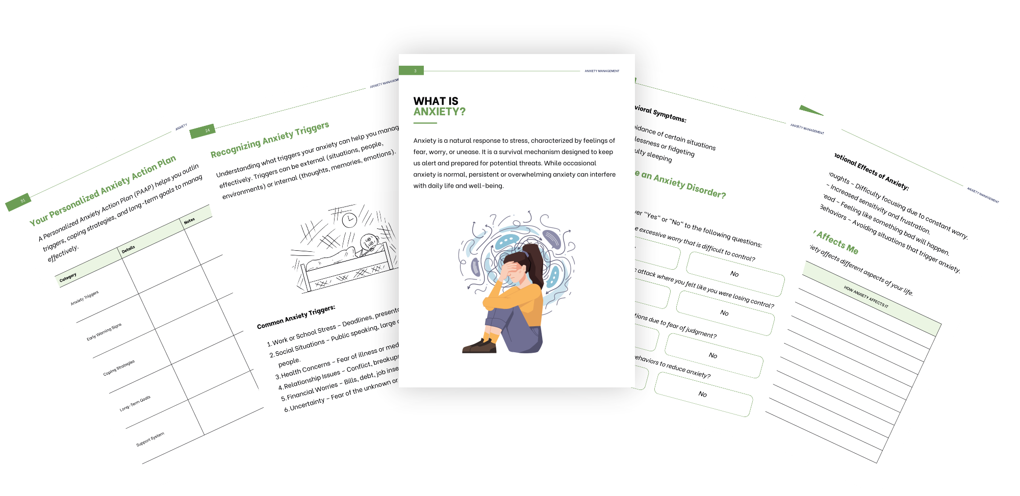 - Calm on command – grounding log, 5-4-3-2-1 tracker, breath-work sheets, and step-by-step PMR guide give instant relief tools (with space to chart what works).