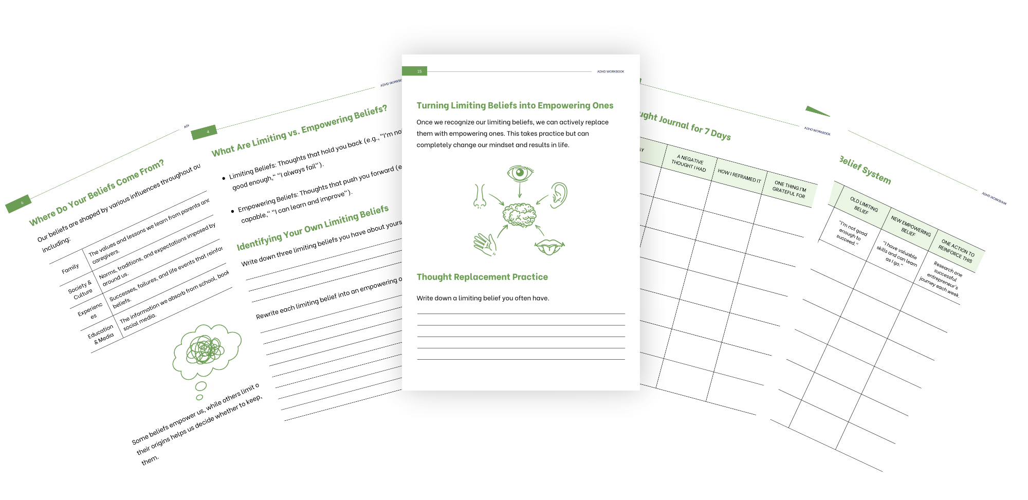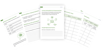 Spot the hidden scripts – limiting-vs-empowering belief inventories, Thought-Belief-Action loop, and origin-mapping charts show exactly what’s been running the show.